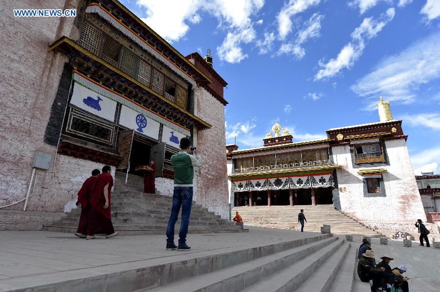 Tourists visit Galden Jampaling Monastery in Qamdo, southwest China's Tibet Autonomous Region, Sept. 21, 2015. Galden Jampaling Monastery was founded by Jansem Sherab Zangpo, one of disciples of Tsongkapa, the founder of Gelug Sect, in 1437. The monastery was listed as national key cultural relics protection site in 2013. (Xinhua/Liu Dongjun)