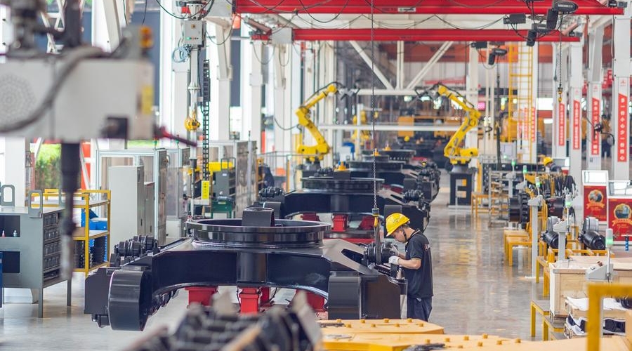 Staff members work on an assembly line of excavators for export to Laos and Myanmar at an equipment manufacturing company in southwest China's Chongqing Municipality, April 21, 2025. [Photo/Xinhua]