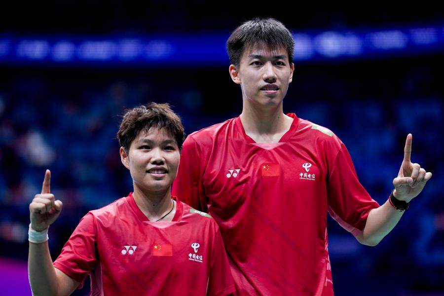 Feng Yanzhe (R)/Huang Dongping of China pose after winning the mixed doubles match against Midorikawa Hiroki/Igarashi Arisa of Japan during their semifinal at the BWF Sudirman Cup in Xiamen, southeast China's Fujian Province, May 3, 2025. (Xinhua/Sun Fei)