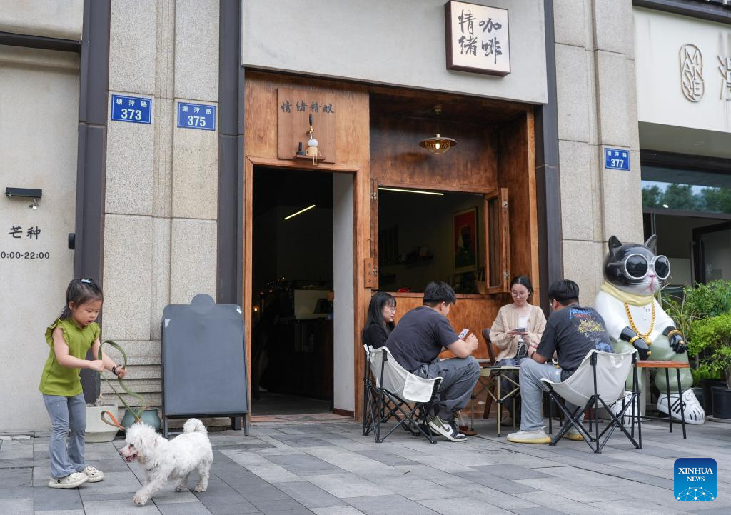 People enjoy their leisure time in front of a cafe in Hangzhou, east China's Zhejiang Province, May 4, 2025. People across China enjoy the ongoing May Day holiday in various ways. [Photo/Xinhua]