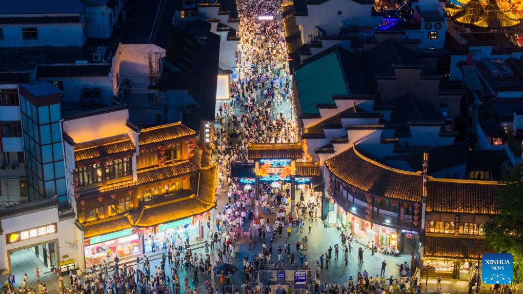 An aerial drone photo taken on May 3, 2025 shows tourists visiting the Fuzimiao scenic area in Nanjing, east China's Jiangsu Province. People across China enjoy the ongoing May Day holiday in various ways. [Photo/Xinhua]