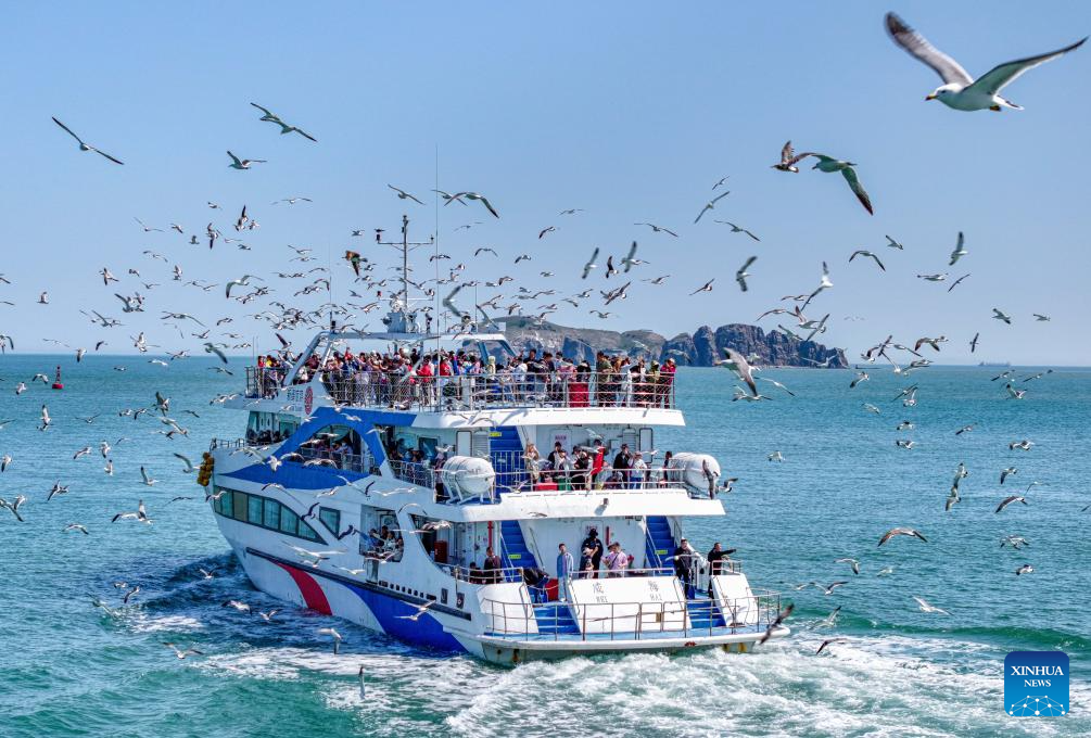 This aerial drone photo taken on May 4, 2025 shows tourists enjoy a boat tour in Rongcheng City, east China's Shandong Province. People across China enjoy the ongoing May Day holiday in various ways. [Photo/Xinhua]