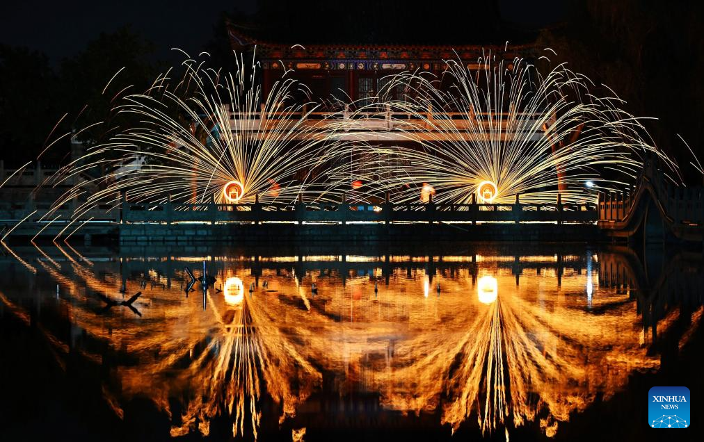 Folk artists perform a molten iron fireworks show in Tengzhong, east China's Shandong Province, May 3, 2025. People across China enjoy the ongoing May Day holiday in various ways. [Photo/Xinhua]