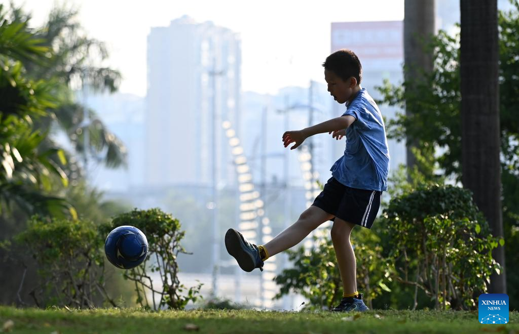 A child plays football by the Nanhu lake in Nanning, south China's Guangxi Zhuang Autonomous Region, May 2, 2025. People across China enjoy the ongoing May Day holiday in various ways. [Photo/Xinhua]