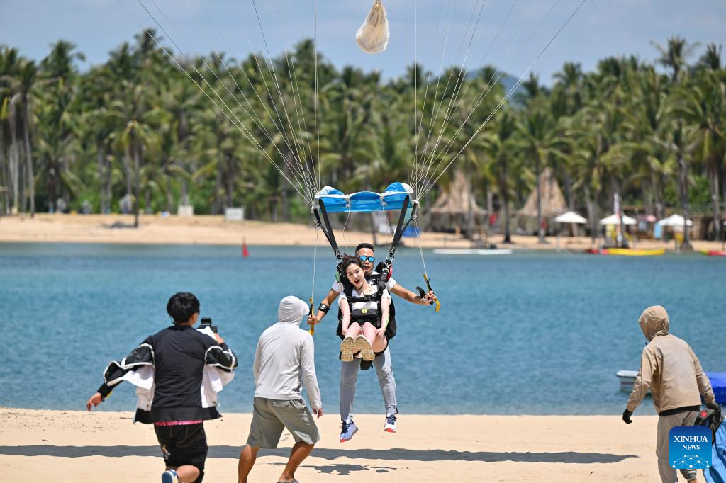 A tourist tries parachuting in Sanya, south China's Hainan Province, May 2, 2025. Low-altitude tourism activities such as paragliding and parachuting have become trendy among tourists to China's island province of Hainan during the May Day holiday. [Photo/Xinhua]