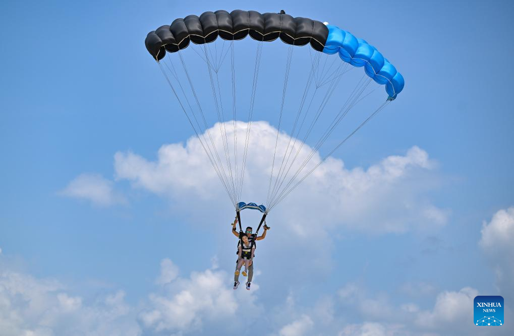 A tourist tries parachuting in Sanya, south China's Hainan Province, May 2, 2025. Low-altitude tourism activities such as paragliding and parachuting have become trendy among tourists to China's island province of Hainan during the May Day holiday. [Photo/Xinhua]