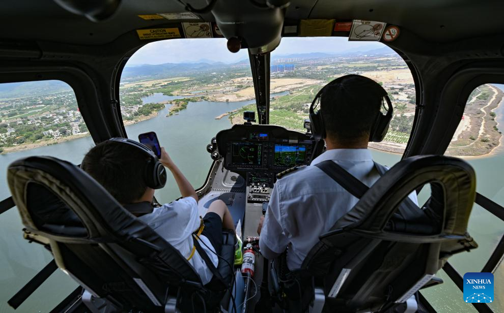 A tourist enjoys a helicopter sightseeing tour in Sanya, south China's Hainan Province, May 3, 2025. Low-altitude tourism activities such as paragliding and parachuting have become trendy among tourists to China's island province of Hainan during the May Day holiday. [Photo/Xinhua]