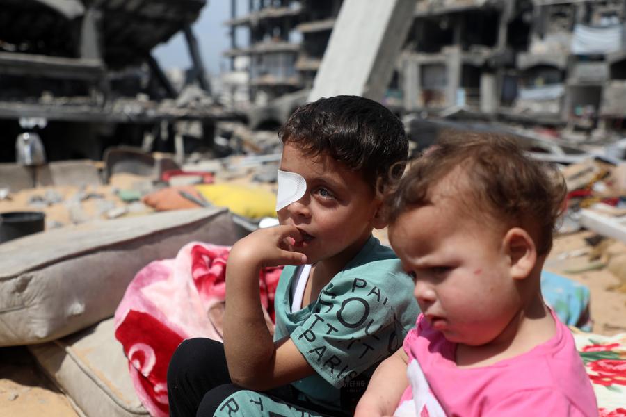 Palestinian child Ahmed Khaled Hijazi (L) is pictured among the rubble in the town of Beit Lahia, northern Gaza Strip, April 27, 2025. [Photo/Xinhua]