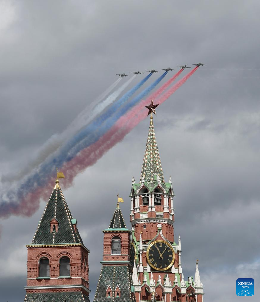 Aircraft fly in formation over Red Square during a rehearsal for the Victory Day military parade, which marks the 80th anniversary of the Victory in the Great Patriotic War, in Moscow, Russia, May 5, 2025. (Xinhua/Ding Haitao)