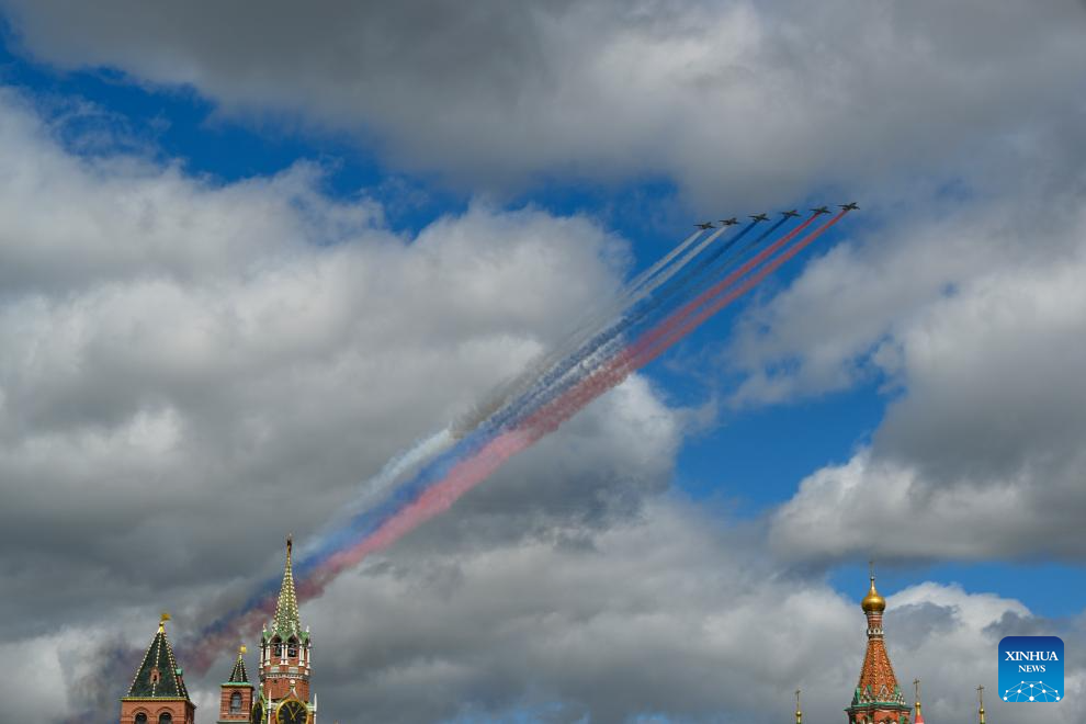 Aircraft fly in formation over Red Square during a rehearsal for the Victory Day military parade, which marks the 80th anniversary of the Victory in the Great Patriotic War, in Moscow, Russia, May 5, 2025. (Xinhua/Zhang Ling)
