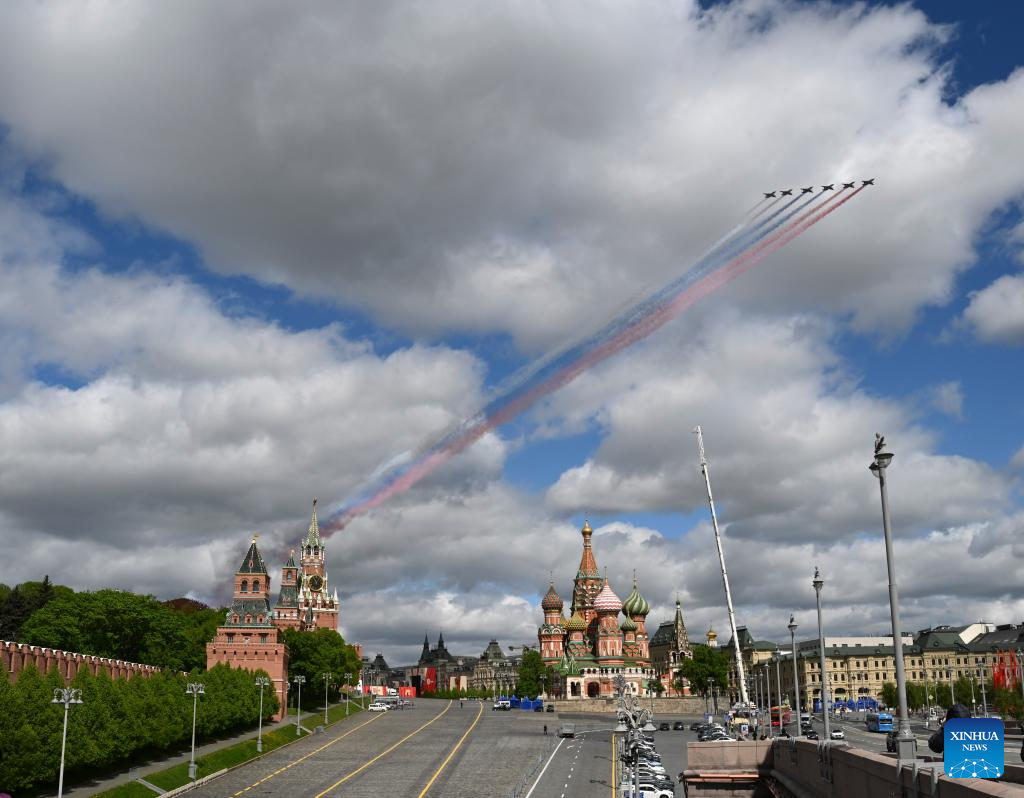 Aircraft fly in formation over Red Square during a rehearsal for the Victory Day military parade, which marks the 80th anniversary of the Victory in the Great Patriotic War, in Moscow, Russia, May 5, 2025. (Xinhua/Zhang Ling)