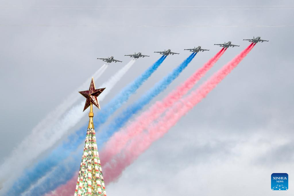 Aircraft fly in formation over Red Square during a rehearsal for the Victory Day military parade, which marks the 80th anniversary of the Victory in the Great Patriotic War, in Moscow, Russia, May 5, 2025. (Photo by Alexander Zemlianichenko Jr/Xinhua)