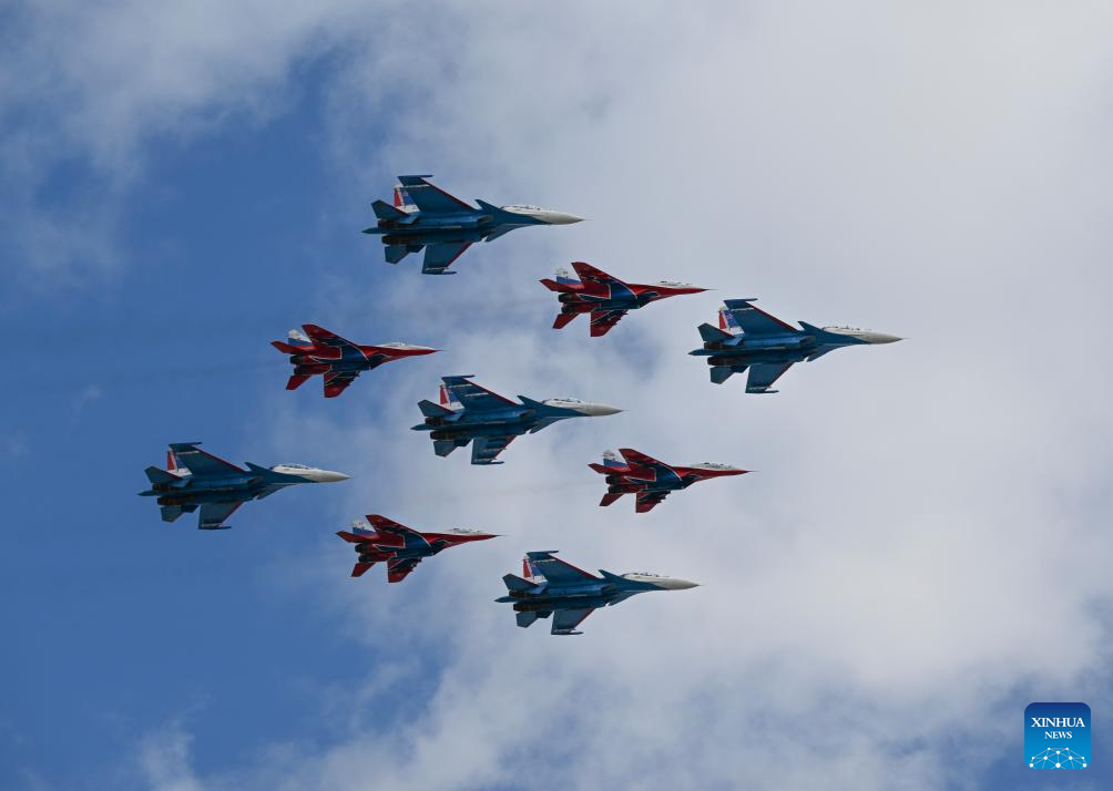 Aircraft fly in formation over Red Square during a rehearsal for the Victory Day military parade, which marks the 80th anniversary of the Victory in the Great Patriotic War, in Moscow, Russia, May 5, 2025. (Xinhua/Zhang Ling)