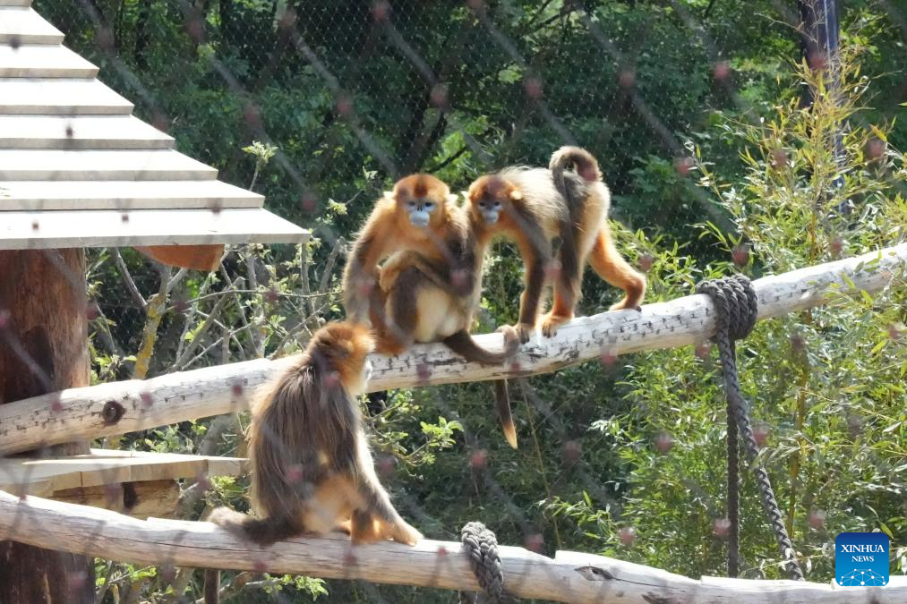 Golden monkeys are seen inside an enclosure at the ZooPark of Beauval in Saint-Aignan, France, on May 7, 2025. Three golden monkeys from China made their public debut on Wednesday at the ZooPark of Beauval, marking the species' first journey outside Asia. [Photo/Xinhua]