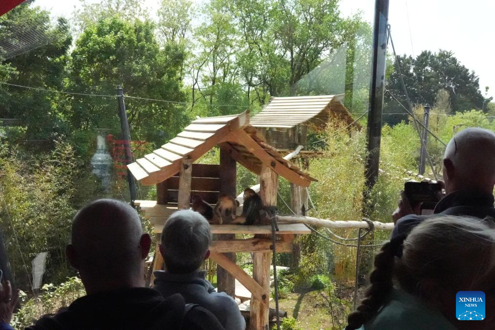 People watch golden monkeys at the ZooPark of Beauval in Saint-Aignan, France, on May 7, 2025. Three golden monkeys from China made their public debut on Wednesday at the ZooPark of Beauval, marking the species' first journey outside Asia. [Photo/Xinhua]