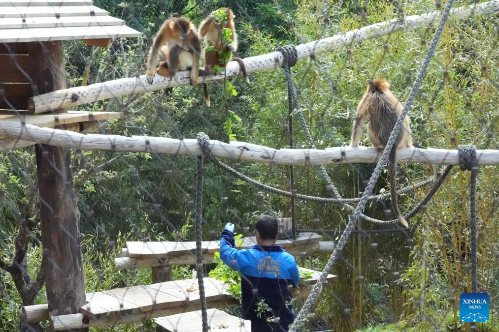 A Chinese zookeeper feeds golden monkeys inside an enclosure at the ZooPark of Beauval in Saint-Aignan, France, on May 7, 2025. Three golden monkeys from China made their public debut on Wednesday at the ZooPark of Beauval, marking the species' first journey outside Asia. [Photo/Xinhua]