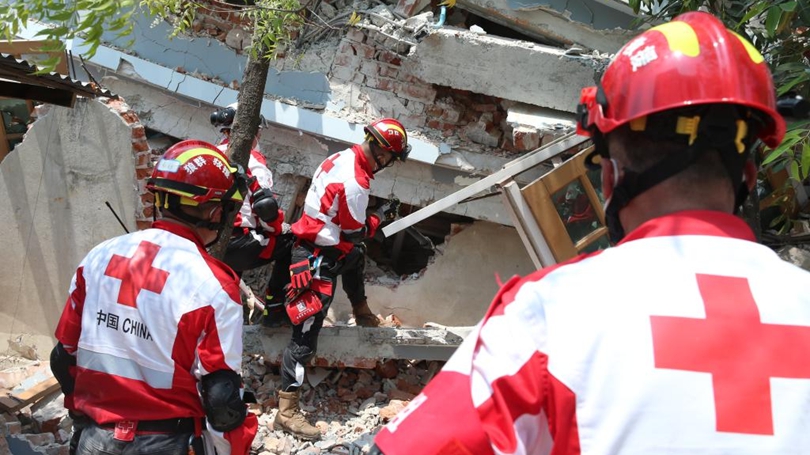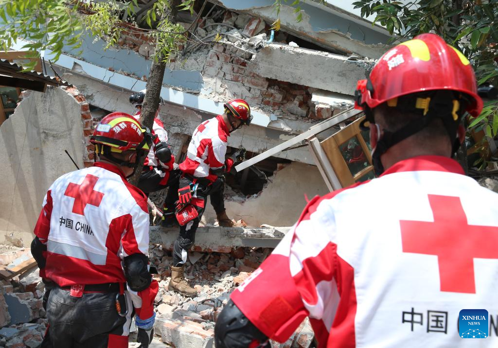Members of the Chinese Red Cross International Emergency Response Team conduct rescue efforts in Mandalay, Myanmar, March 31, 2025. [Photo/Xinhua]