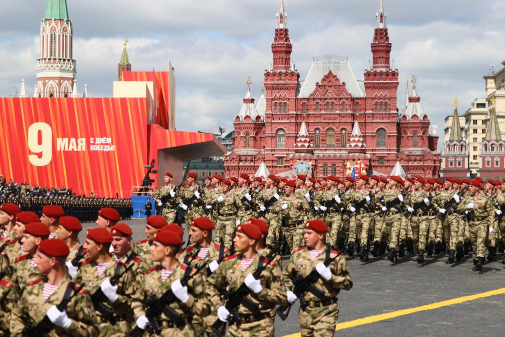 Soldiers march during a grand parade marking the 80th anniversary of the victory in the Soviet Union's Great Patriotic War in Moscow, Russia, May 9, 2025. (Xinhua/Bai Xueqi)
