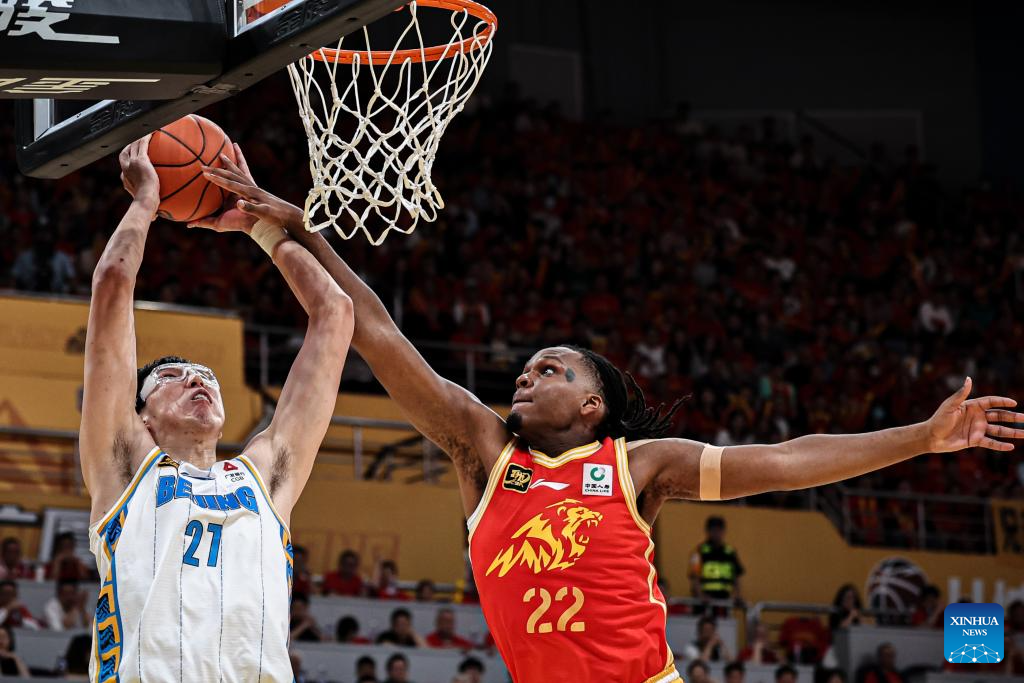 Joshua Carlton (R) of Zhejiang Lions blocks Zhou Qi of Beijing Ducks during the playoff final 2nd round match between Zhejiang Lions and Beijing Ducks at the 2024-2025 season of the Chinese Basketball Association (CBA) league in Hangzhou, east China's Zhejiang Province, May 9, 2025. (Xinhua/Jiang Han)