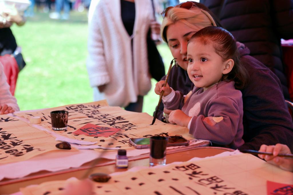 A girl learns Chinese calligraphy at the 4th edition of the Chinese New Year cultural festival at the National Arts Center in Mexico City, capital of Mexico, Jan. 25, 2025. [Xinhua]
