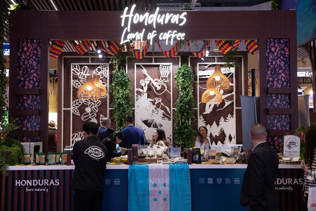 Visitors learn about coffee beans at the booth of Honduras at the 6th China International Import Expo (CIIE) in east China's Shanghai, Nov. 6, 2023. [Xinhua]