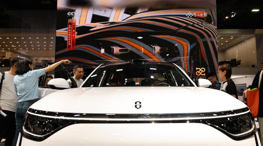 Visitors look at an AITO M8 at the 21st Shanghai International Automobile Industry Exhibition in east China's Shanghai, May 1, 2025. [Photo/Xinhua]