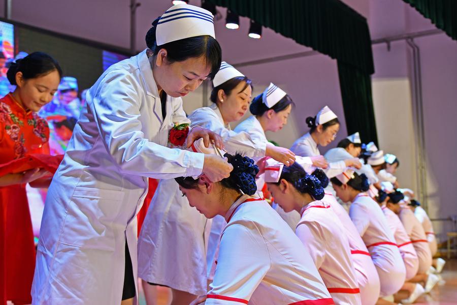 Nursing students receive their nurse's caps at a capping ceremony at Yantai Nurses School of Shandong in Yantai, east China's Shandong province, May 8, 2025. [Photo/Xinhua]
