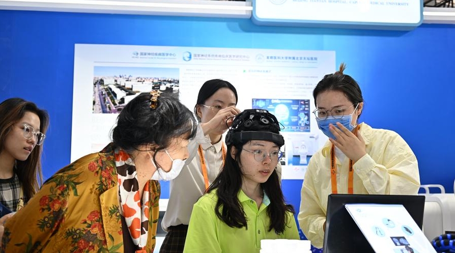 A visitor experiences domestic brain-computer interface system at the booth of Beijing Tiantan Hospital during the 2023 China International Fair for Trade in Services (CIFTIS) at Shougang Park in Beijing, capital of China, Sept. 5, 2023. [Photo/Xinhua]
