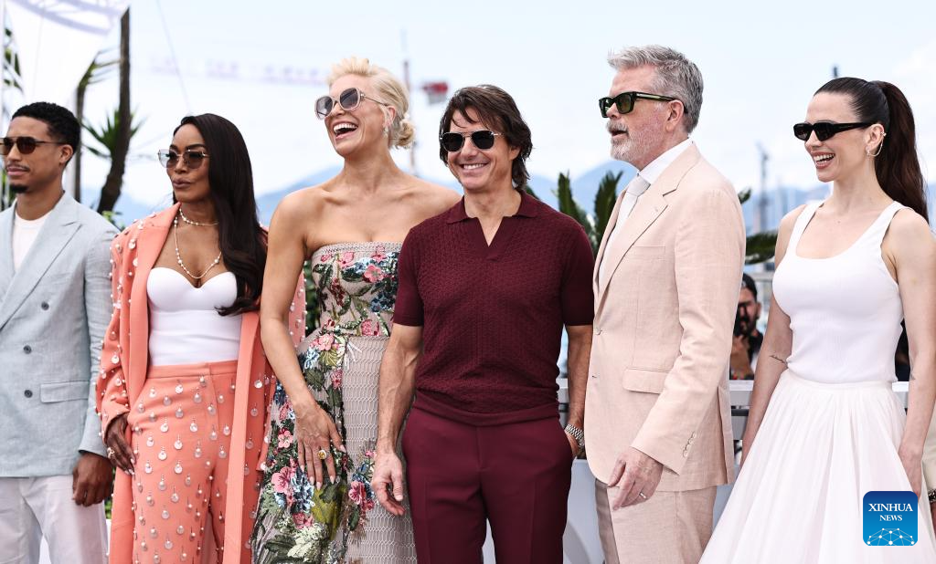 U.S. actor and producer Tom Cruise (3rd R), U.S. director, screenwriter and producer Christopher McQuarrie (2nd R) and cast members pose for a photocall for the film "Mission: Impossible - The Final Reckoning" at the 78th edition of the Cannes Film Festival in Cannes, southern France, on May 14, 2025. (Xinhua/Gao Jing)