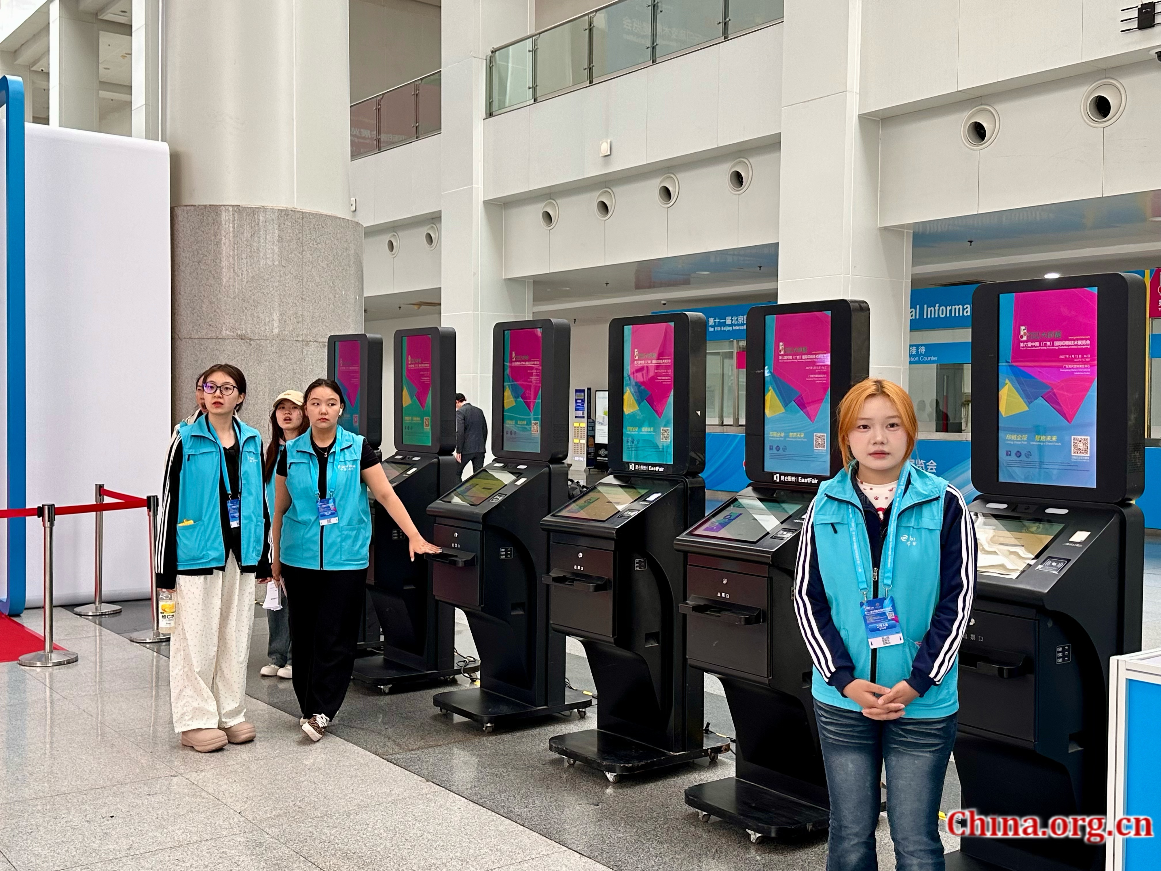 Staff members stand beside advanced printing equipment ready to assist visitors at the 11th Beijing International Printing Technology Exhibition in Beijing, May 15, 2025. [Photo by Liu Caiyi/China.org.cn]