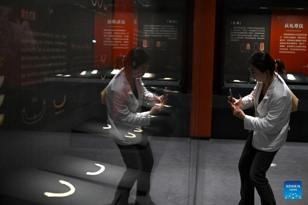 A visitor takes a photo of exhibits at the Lingjiatan Site Museum in Hanshan County, Ma'anshan City of east China's Anhui Province, May 16, 2025. (Xinhua/Huang Bohan)