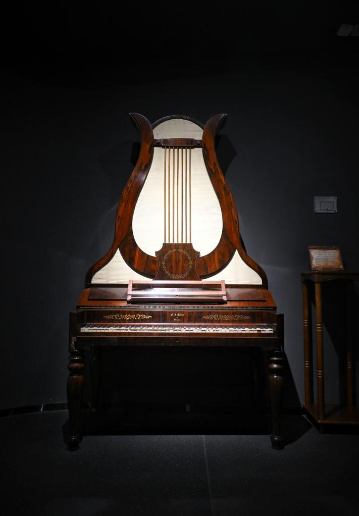This photo taken on May 11, 2025 shows a German harp piano from mid 19th century displayed at the Chengdu Xin Smart Music Museum in Chengdu, southwest China's Sichuan Province. (Xinhua/Liu Kun)