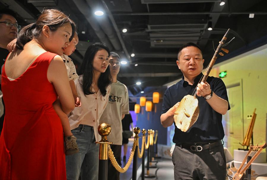 This photo taken on May 11, 2025 shows Ye Hao (1st R), curator of the Chengdu Xin Smart Music Museum, explaining an African instrument to visitors at his museum in Chengdu, southwest China's Sichuan Province. (Xinhua/Liu Kun)