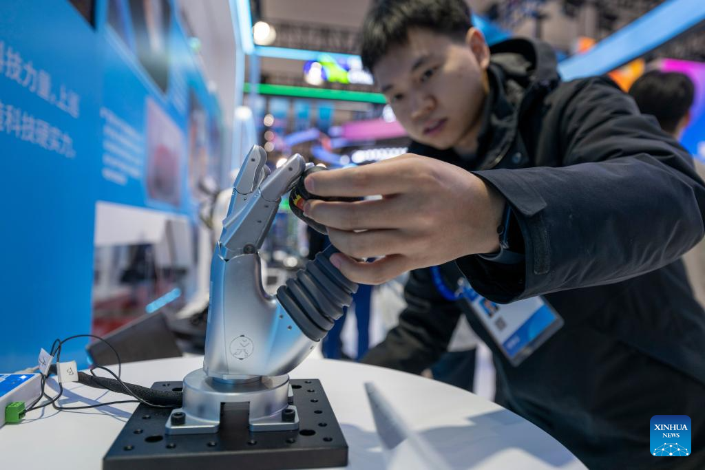 A robotic hand is pictured at the 34th Harbin International Economic and Trade Fair in Harbin, capital of northeast China's Heilongjiang Province, May 17, 2025. The fair opened here on Saturday, attracting exhibitors from over 110 countries and regions. (Xinhua/Zhang Tao)