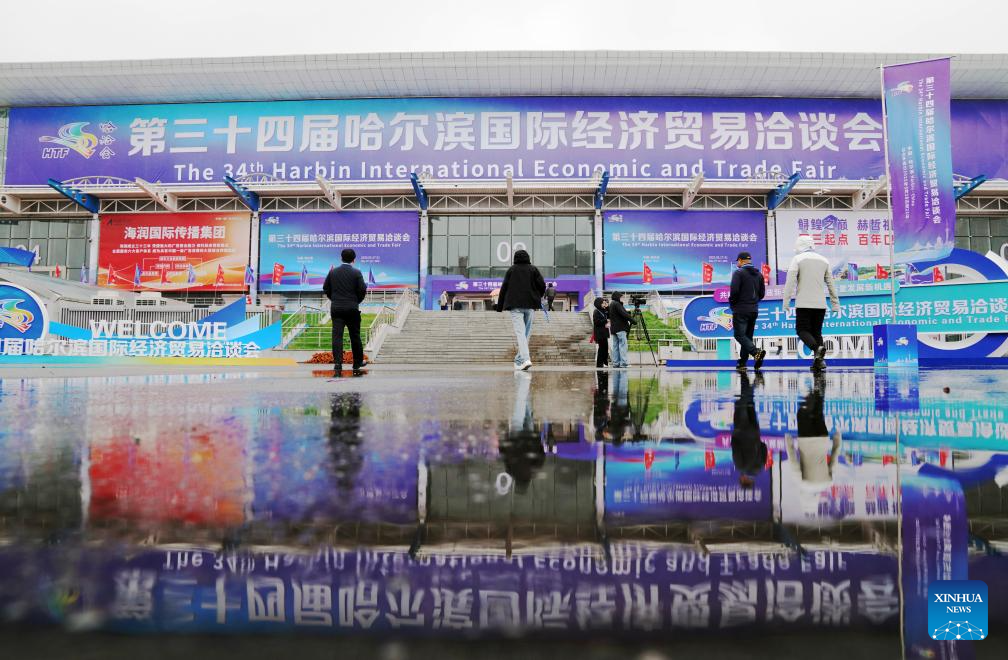 Visitors walk to the venue of the 34th Harbin International Economic and Trade Fair in Harbin, capital of northeast China's Heilongjiang Province, May 17, 2025. The fair opened here on Saturday, attracting exhibitors from over 110 countries and regions. (Xinhua/Wang Song)