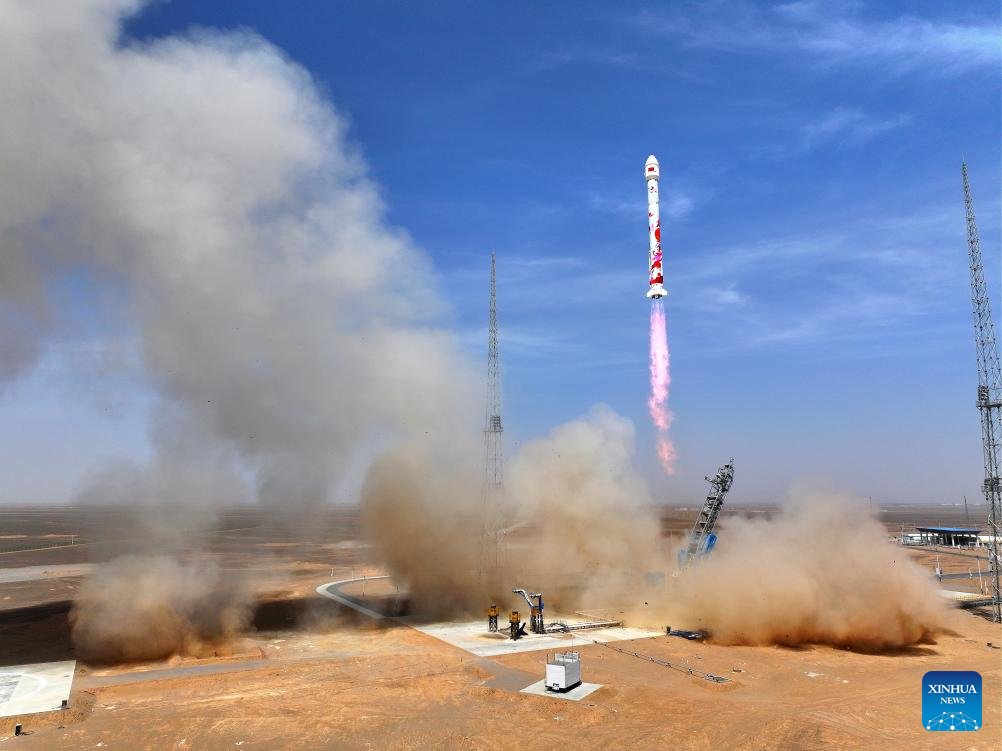 A commercial rocket coded ZQ-2E Y2 blasts off from the Dongfeng commercial space innovation pilot zone near the Jiuquan Satellite Launch Center in northwest China, May 17, 2025. The rocket lifted off on Saturday in northwest China, successfully sending six satellites into space. (Photo by Wang Jiangbo/Xinhua)