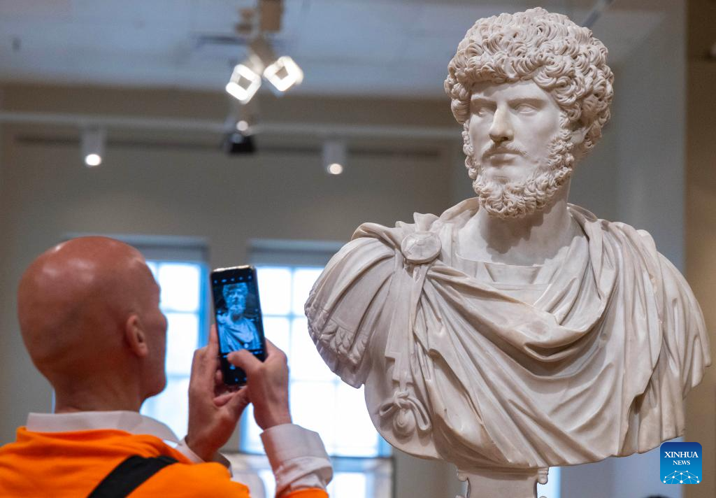 A visitor captures images of a portrait bust at the Royal Ontario Museum in Toronto, Canada, May 18, 2025.