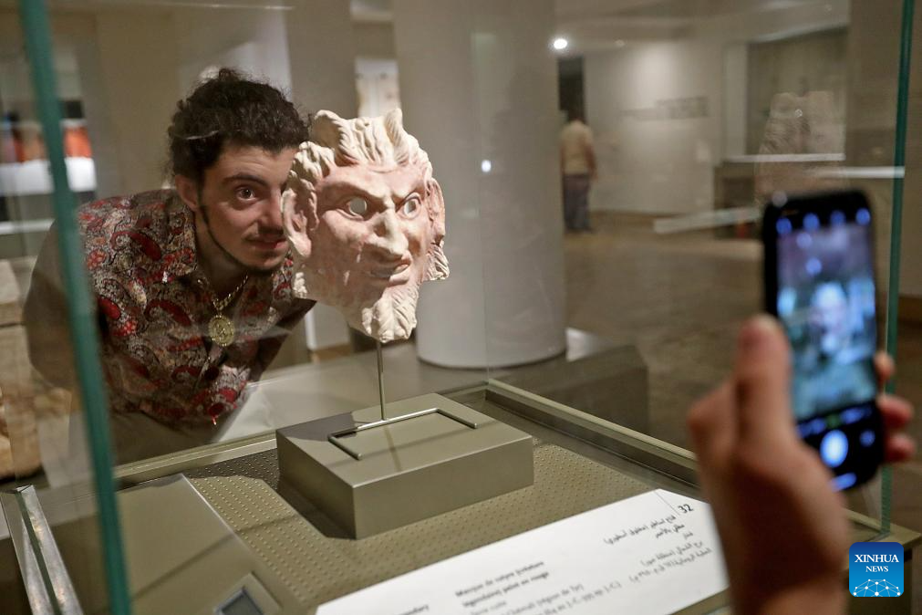 A visitor poses for photos with an exhibit at Lebanon's National Museum in Beirut, Lebanon, on May 18, 2025. On the occasion of International Museum Day, Lebanon's National Museum in Beirut opened its door to the public for free on Sunday, inviting visitors to discover the country's ancient civilizations and archaeological treasures. (Xinhua/Bilal Jawich)