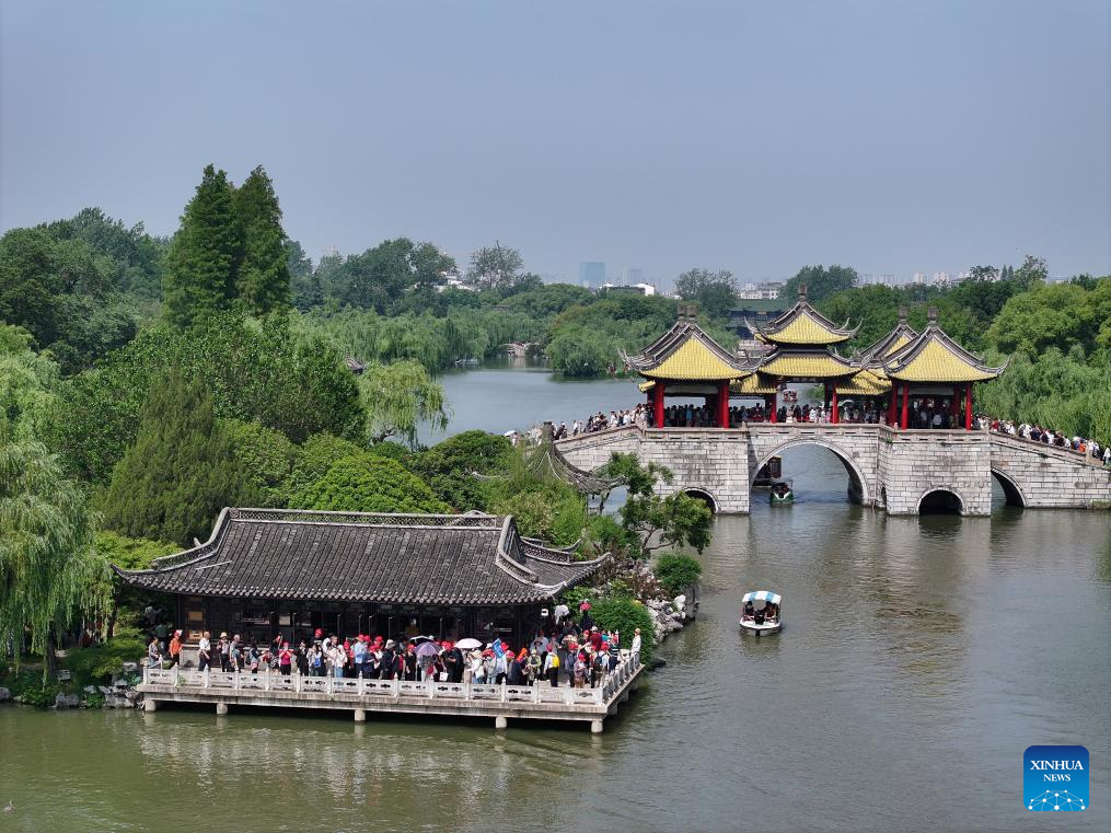 An aerial drone photo taken on May 19, 2025 shows tourists visiting the Slender West Lake scenic spot in Yangzhou, east China's Jiangsu province. This year's May 19 marks the 15th China Tourism Day. (Photo by Meng Delong/Xinhua)