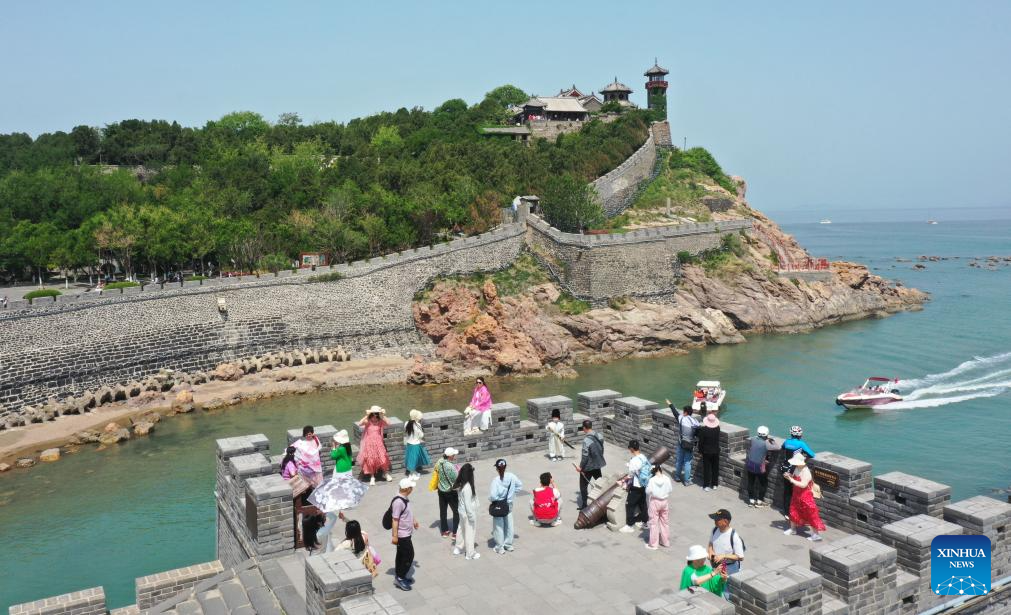 An aerial drone photo taken on May 19, 2025 shows tourists visiting the Penglai Pavilion scenic spot in Yantai, east China's Shandong province. This year's May 19 marks the 15th China Tourism Day. (Photo by Yu Liangyi/Xinhua)