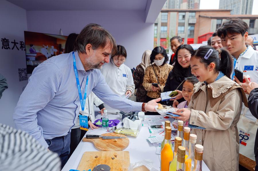 Visitors taste pizza at the booth of Italy at 2025 Chengdu Europe Culture Season & European Culture Street in Chengdu, southwest China's Sichuan Province, April 12, 2025. [Photo/Xinhua]