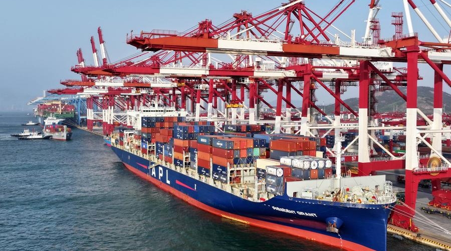 An aerial drone photo taken on April 30, 2025 shows a cargo ship berthing at a container dock of Qingdao Port in Qingdao, east China's Shandong Province. [Photo/Xinhua]