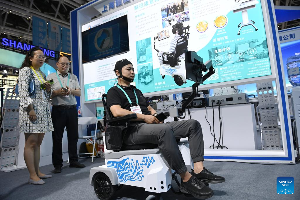 A staff member demonstrates how to use a rehabilitation wheelchair during the 9th Silk Road International Exposition and the Investment and Trade Forum for Cooperation between East & West China in Xi'an, northwest China's Shaanxi Province, May 21, 2025. The five-day event kicked off in Xi'an on Wednesday. (Xinhua/Li Yibo)
