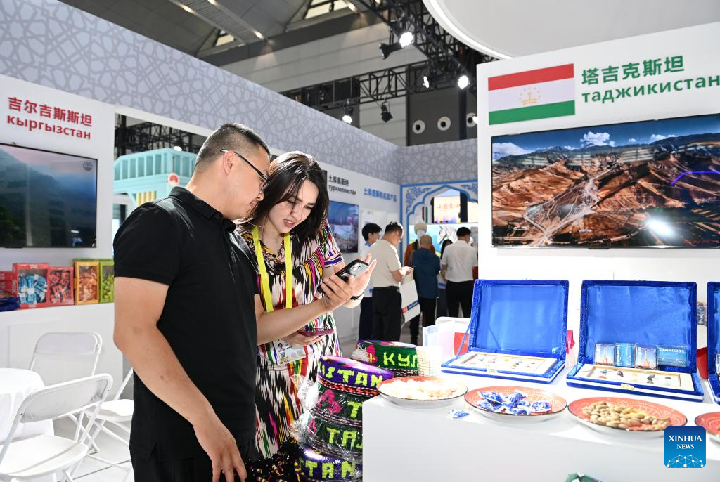 Visitors learn about Tajik products during the 9th Silk Road International Exposition and the Investment and Trade Forum for Cooperation between East & West China in Xi'an, northwest China's Shaanxi Province, May 21, 2025. The five-day event kicked off in Xi'an on Wednesday. (Xinhua/Li Yibo)