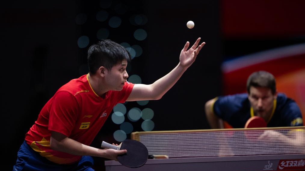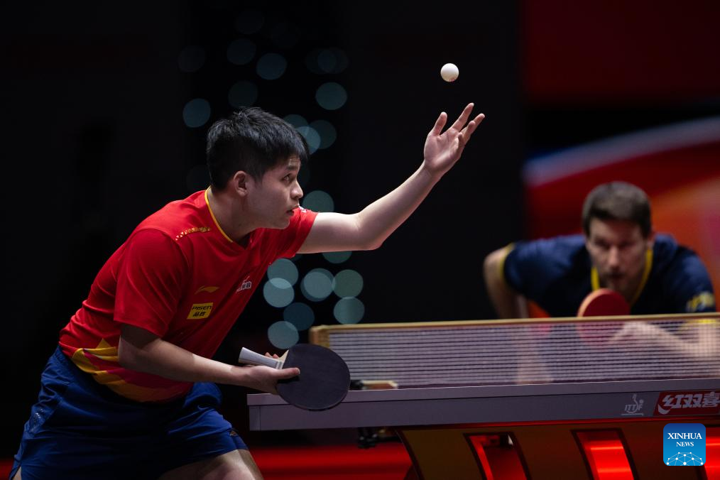 Lin Shidong serves during the men's singles round of 32 match between Lin Shidong of China and Kristian Karlsson of Sweden at ITTF World Table Tennis Championships Finals Doha 2025 in Doha, Qatar, May 21, 2025. (Xinhua/Xiao Yijiu)