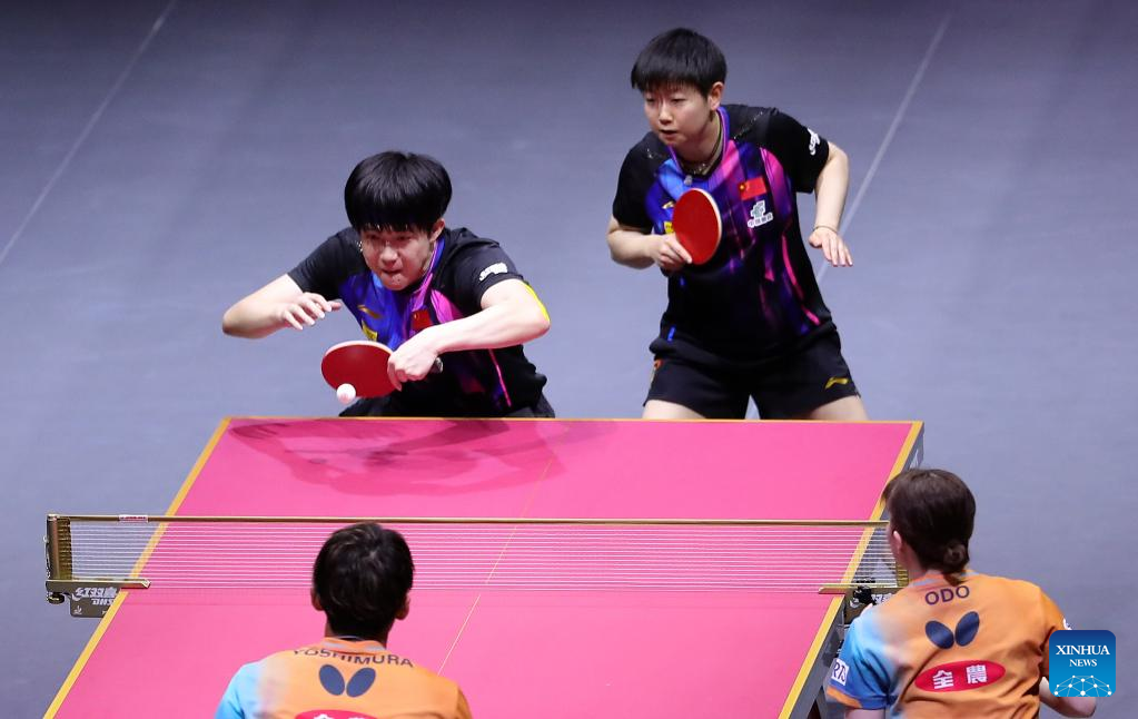 Wang Chuqin (Top L)/Sun Yingsha (Top R) compete during the mixed doubles final between Wang Chuqin/Sun Yingsha of China and Yoshimura Maharu/Odo Satsuki of Japan at ITTF World Table Tennis Championships Finals Doha 2025 in Doha, Qatar, May 24, 2025. (Xinhua/Wang Dongzhen)