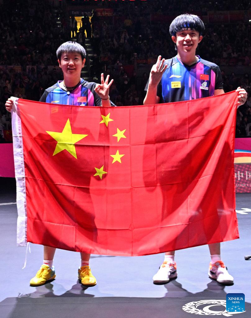 Wang Chuqin (R)/Sun Yingsha celebrate winning the mixed doubles final between Wang Chuqin/Sun Yingsha of China and Yoshimura Maharu/Odo Satsuki of Japan at ITTF World Table Tennis Championships Finals Doha 2025 in Doha, Qatar, May 24, 2025. (Xinhua/Xiao Yijiu)