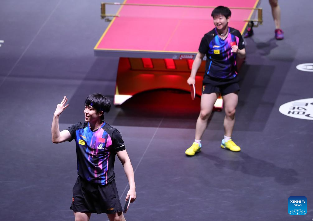Wang Chuqin (L)/Sun Yingsha celebrate winning the mixed doubles final between Wang Chuqin/Sun Yingsha of China and Yoshimura Maharu/Odo Satsuki of Japan at ITTF World Table Tennis Championships Finals Doha 2025 in Doha, Qatar, May 24, 2025. (Xinhua/Wang Dongzhen)
