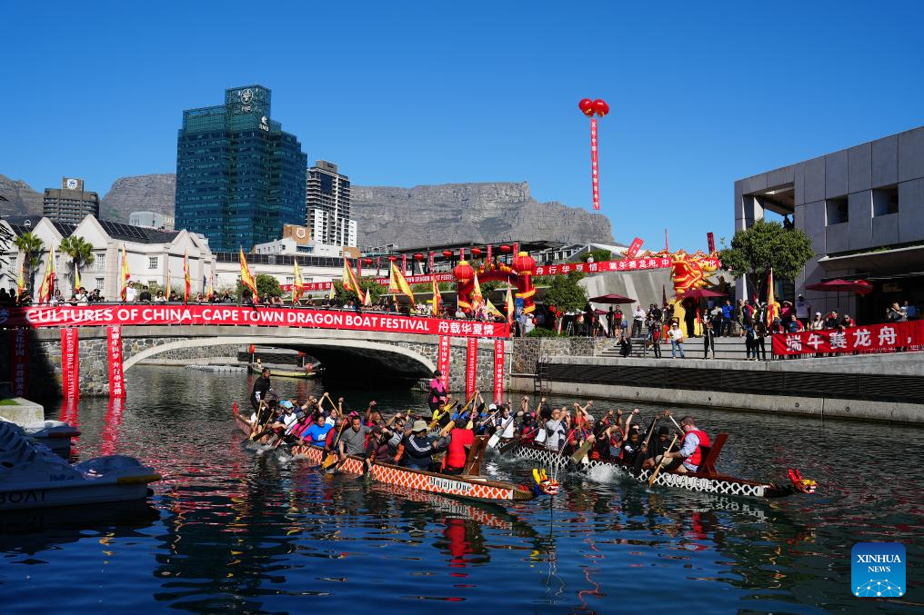 Dragon boat teams take part in a 1,500-meter race during the Dragon Boat Festival in Cape Town, South Africa, May 24, 2025. (Xinhua/Wang Lei)