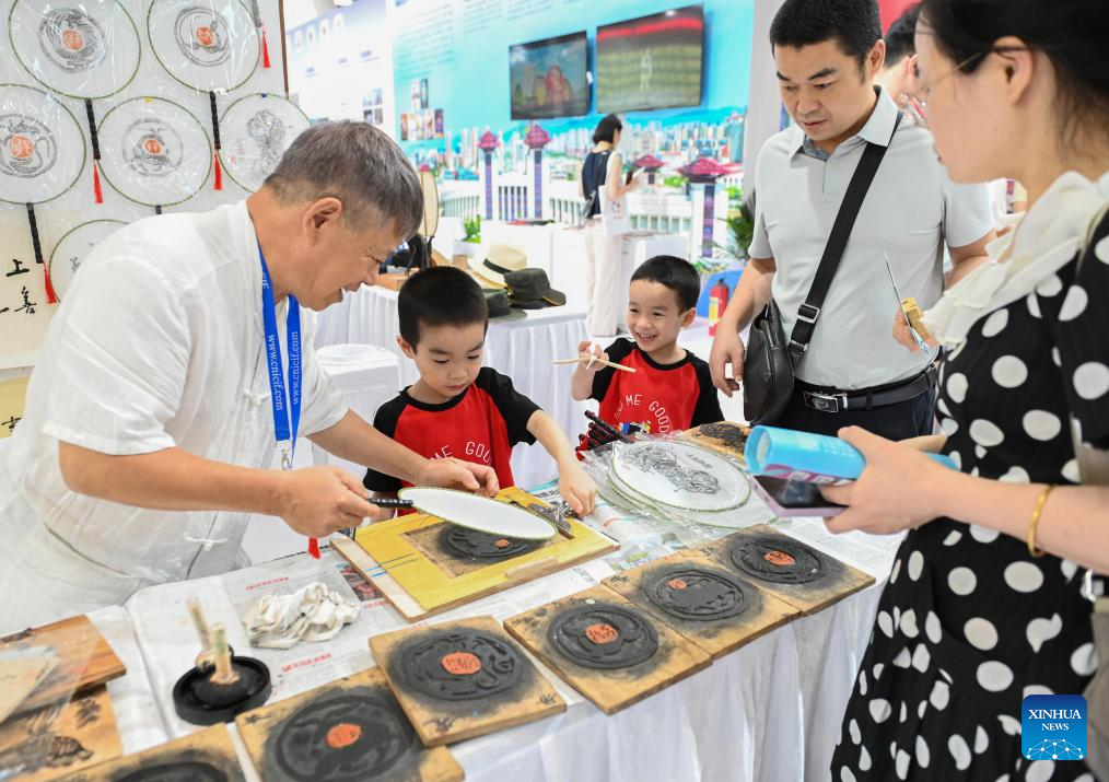 Children experience a traditional Chinese printing skill at the exhibition area of Jiangxi Province during the 21st China (Shenzhen) International Cultural Industries Fair in Shenzhen, south China's Guangdong Province, May 24, 2025. Opened here on Thursday, the five-day event is being held across eight exhibition halls -- three comprehensive spaces and five specialized areas. Activities related to traditional culture and cultural heritages attracted many young visitors. [Photo/Xinhua]